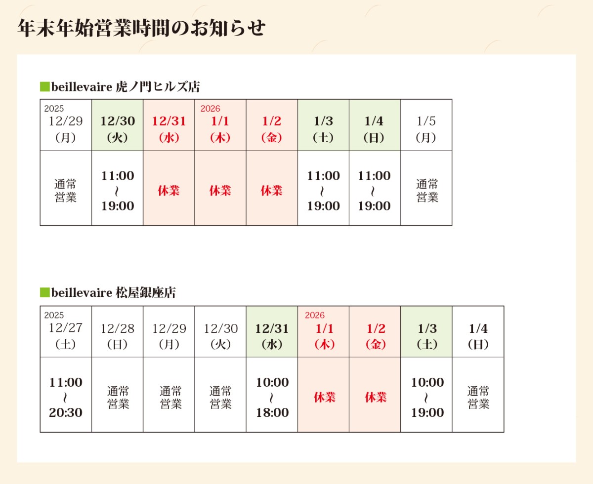 beillevaire各店舗の営業時間につきまして、下記の通りご案内申し上げます。